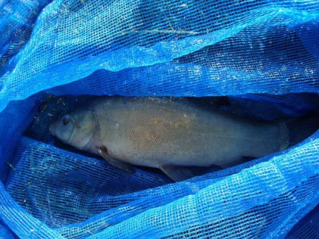 Nem éppen az ilyen visszatörős görbülésekre tervezték, egyszer már így sikerült törnöm rakót. Szerencsére most nem volt semmiféle kritikuspillanat, rövidítés után továbbra is kitartóan, de már egyre kisebb intenzitással húzott. Mindenképp pontynak ítéltem, mert makacsul ragaszkodott a vízfenékhez, és nem akarta megmutatni magát. Néhány pici tiszteletkör után aztán vízfelszín közelébe került és megpillantottam a talán legszebb halszínt, a ZÖLDET juhéééé, egy compó! Megszákoltam, és a nap fényében gyönyörködtem a csodálatos színeiben. A szakállnélküli horog nem okozott neki semmi nagyobb sérülést, óvatosan visszaengedtem éltető elemébe. Remélem legközelebb is összehoz vele a horgászsors.